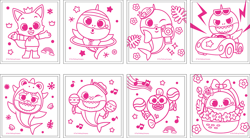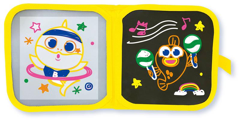 ●內容物:含6枝特殊彩繪筆、6頁彩繪畫板(其中2頁為透明畫板)和8張碰碰狐和鯊魚家族描繪塗鴉紙。