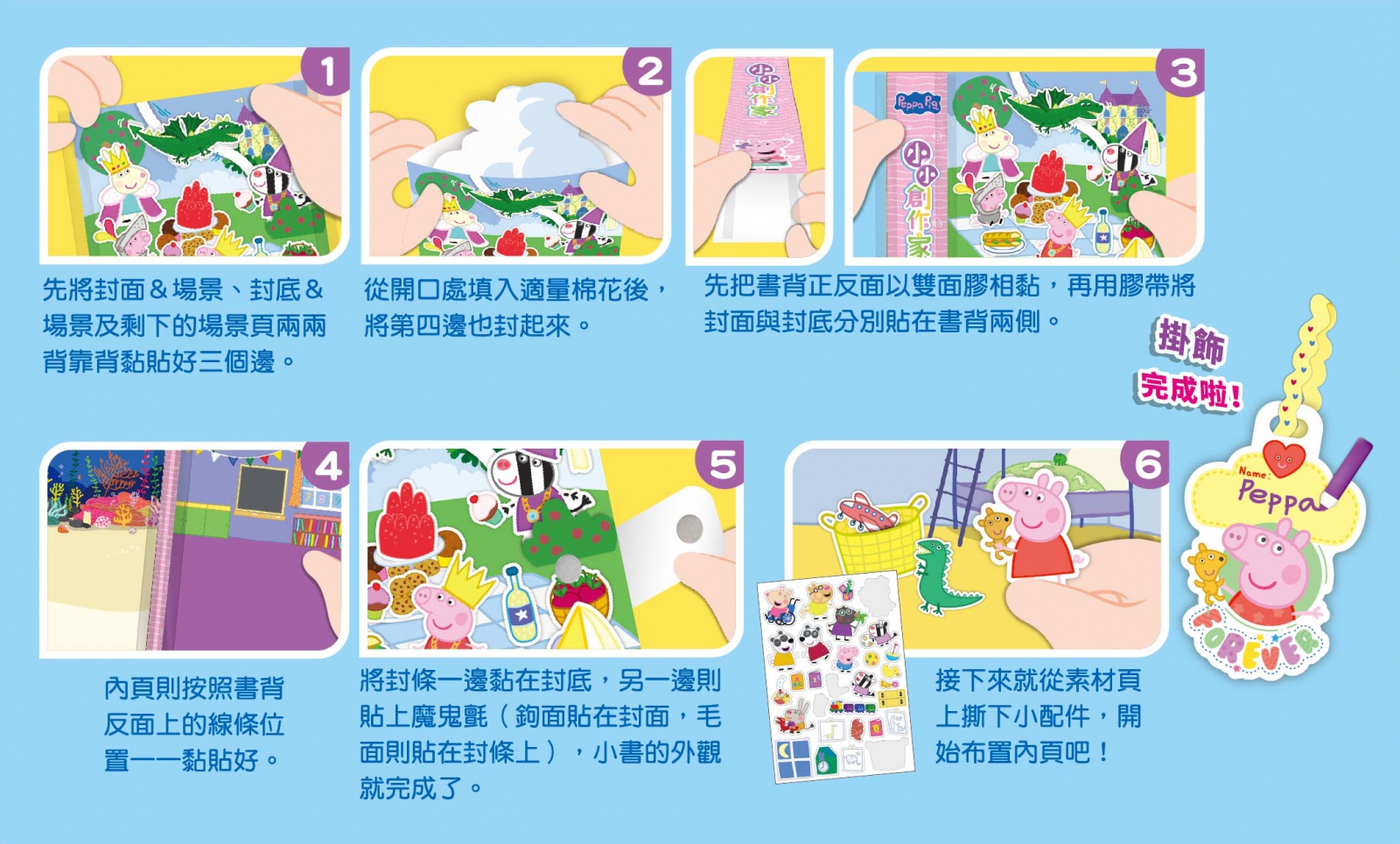內含8張免裁切素材、6張特色場景、1套亮晶晶封面+封底與1組DIY工具包(PP棉、透明膠帶、雙面膠、魔鬼氈)。快來發揮創意,製作專屬自己的可愛小書吧!