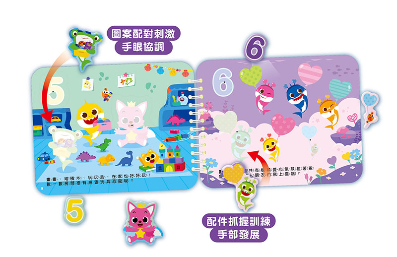 1. 打開寶貝貼貼書,準備好跟鯊魚寶寶一起學123。